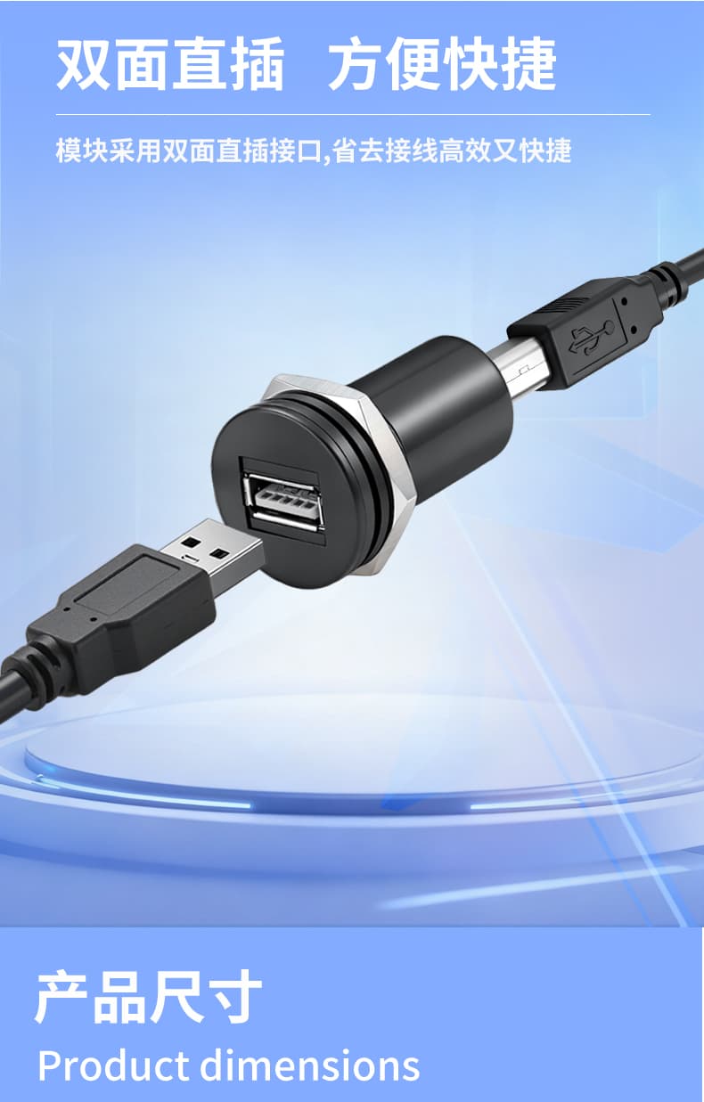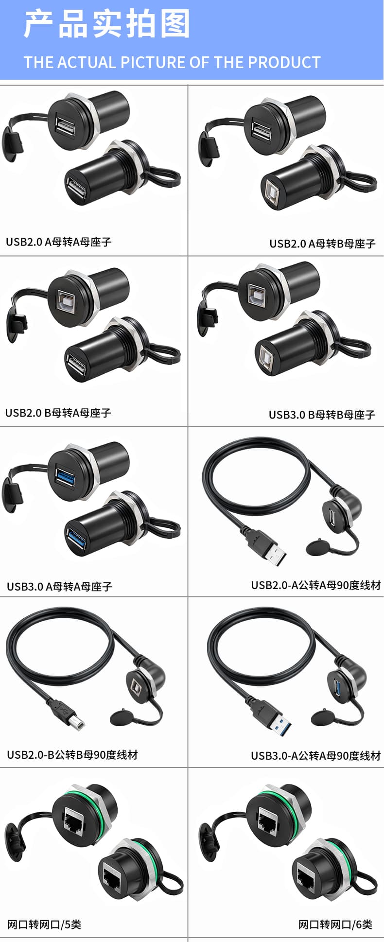 ,包含了USB2.0/USB3.0,有单独的母对母转接,也有母对公带线材的转接,可满足多种使用场景,弯角的设计同时也更节省空间,带线的产品均可按照要求定制长度。