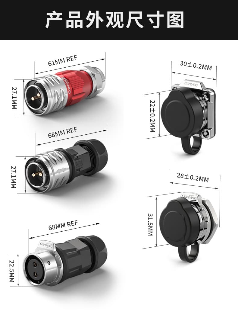 为金属类产品,可满足更为复杂的使用场景。绚丽的颜色增加产品外观的美观性,单手操作简单,连接稳定,可实现IP67等级的防水性能;广泛应用于工业控制,测量和视听设备,通讯行业等领域。